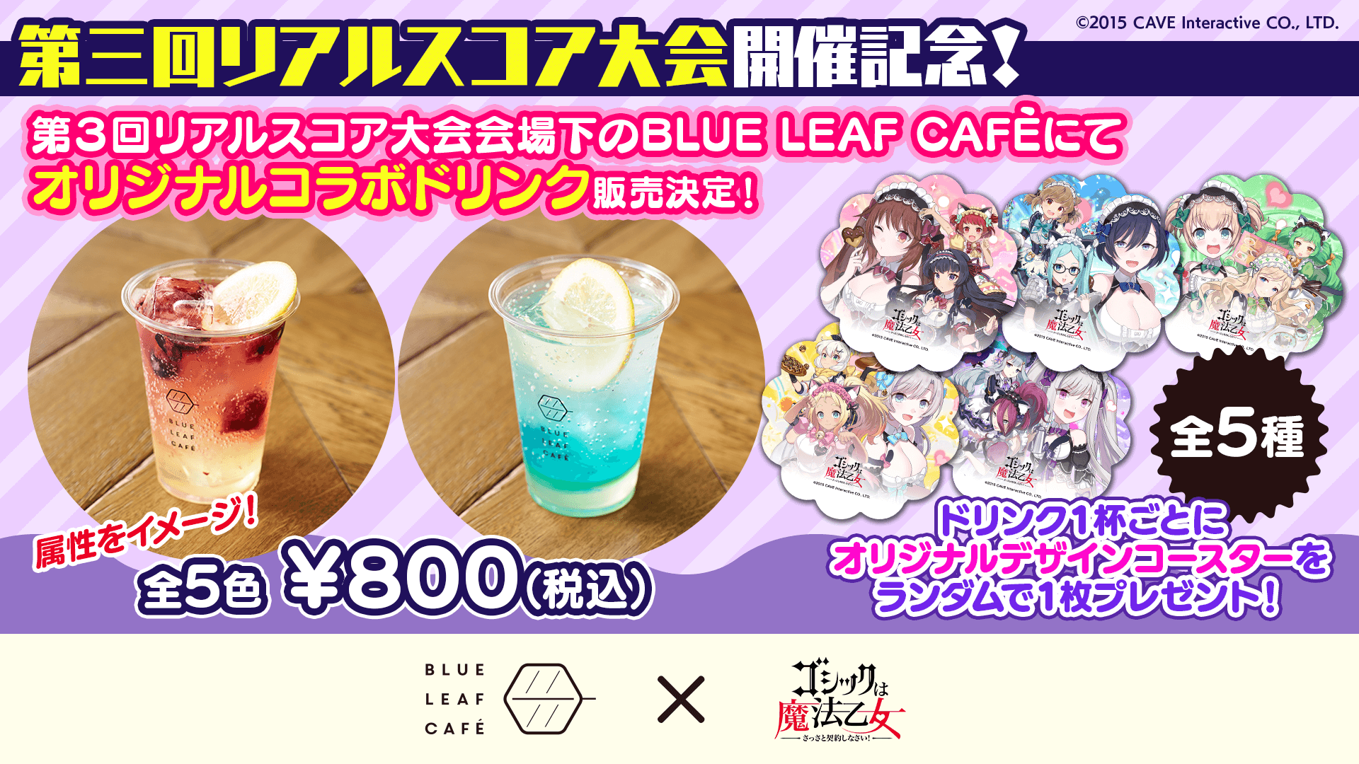 第3回リアルスコア大会会場「esports Style UENO」下のカフェ「BLUE LEAF CAFÉ (上野)」にて属性をイメージしたオリジナルコラボドリンクを販売!コラボドリンク1杯ごとにオリジナルデザインコースターをランダムで1枚プレゼント!
