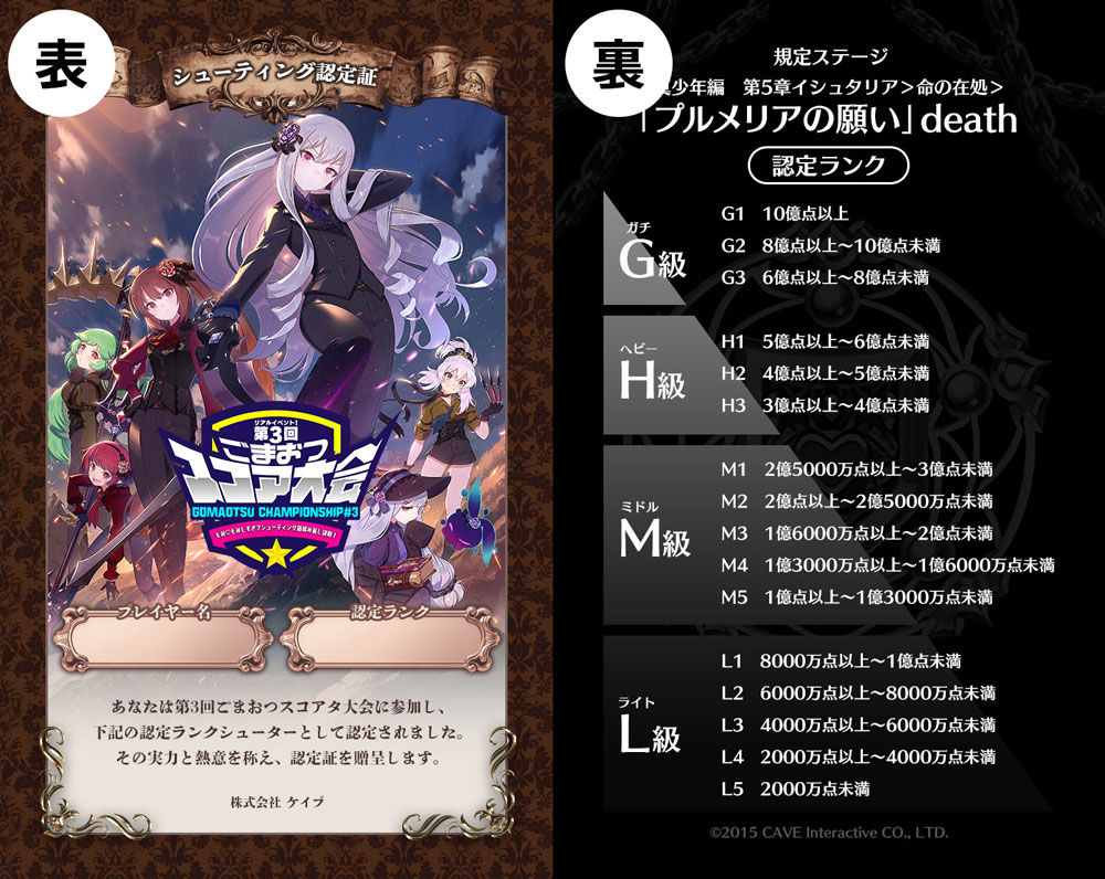 ケイブが主催および出展するリアルイベント会場に設置される「認定証受付」にて発行されます。 規定ステージのベストスコアを提示することで、下記【認定ランク】にもとづいた 「認定証」が発行されます。